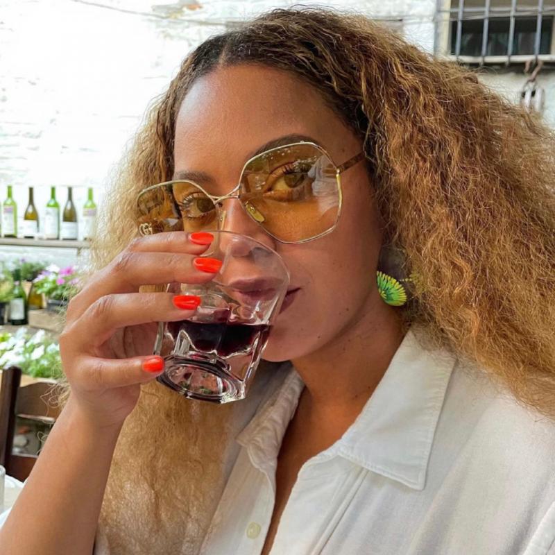 Oversized gold metal frame with tinted pink lenses. Gold marmont metal decal on lens. Gorgeous detailing on metal.