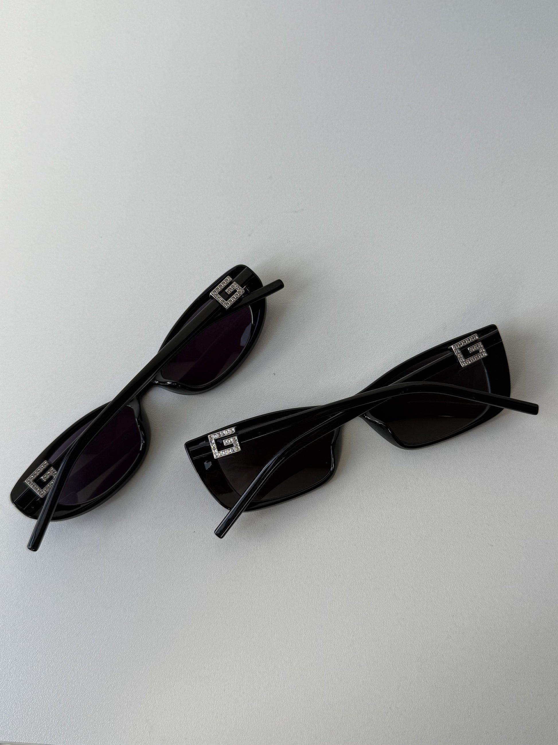 Silver crystal logos. Dark grey lenses. 100% UVA Protected.